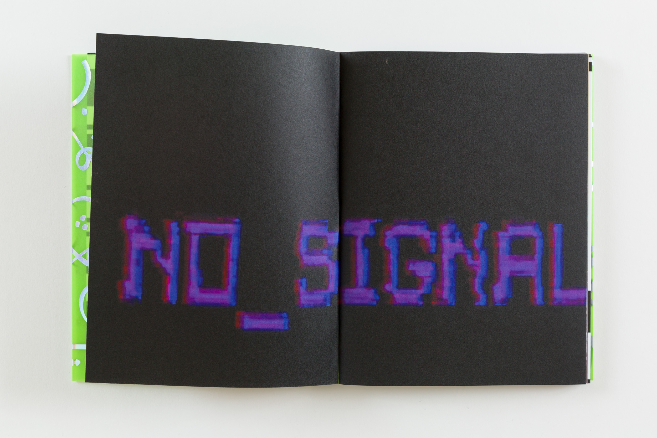 On the cover is an array of symbols—a fabricated language created by the artist—that are redrawn and reproduced in a dizzying holofoil on a transparent neon dust jacket. Peering through the jacket, the cover reveals a pixelated glitch from one of Ali’s films, highlighting an in-between moment, a fracture of language, a broken system of codes. Without a doubt these distinct elements cohere into a material experience for the reader where she is invited to enter and teeter on the edge of language and power.