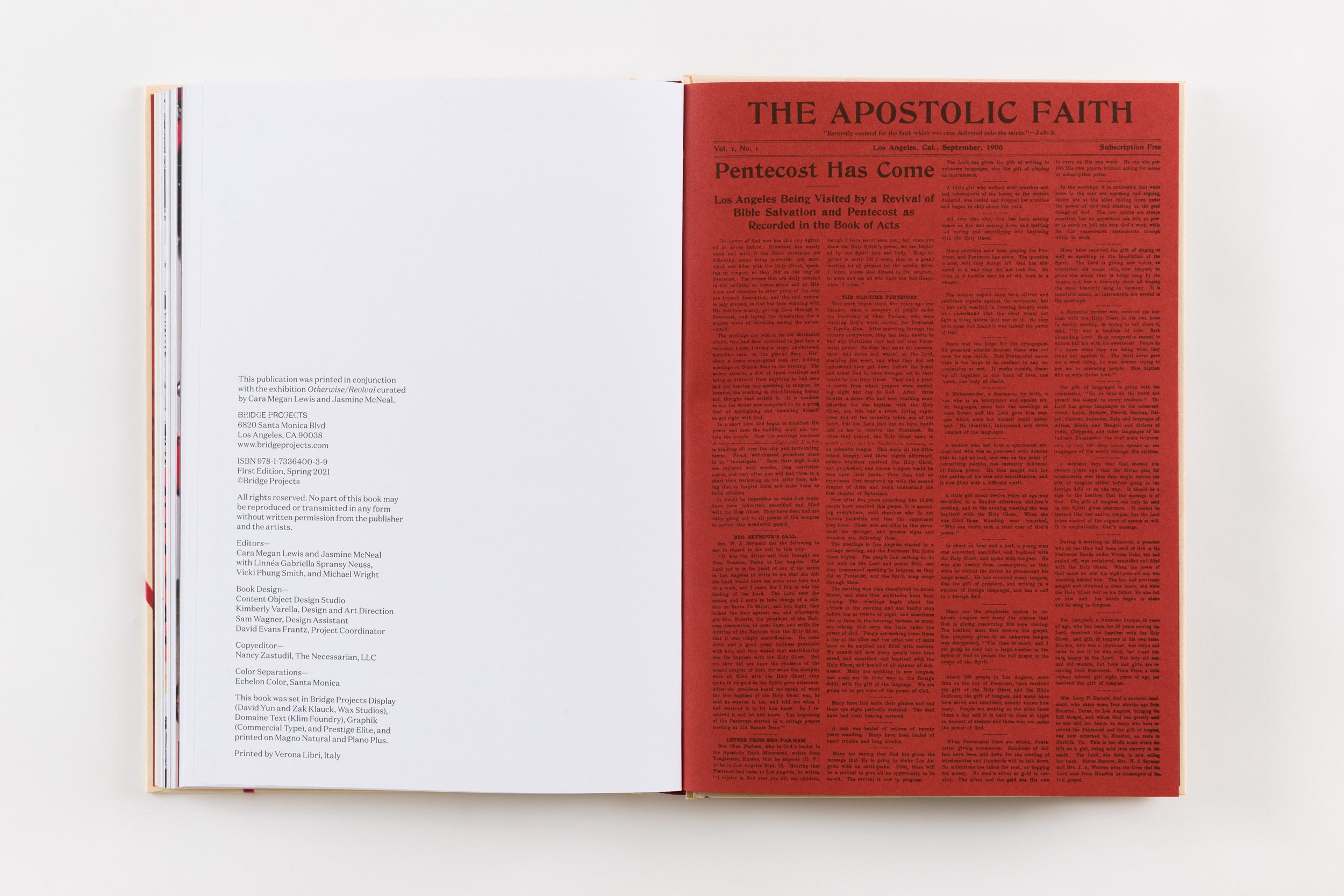 This publication accompanies Otherwise/Revival, a group exhibition that visualizes the impact of the historic Black church—specifically the Black Pentecostal movement—on contemporary artists. Inspiration for the exhibition is drawn from reflecting on the event of the Azusa Street Revival, and the publication itself borrows from traditional hymnals in it’s materiality and form. Sculptures, paintings, video, and performances celebrate the significance of music, praise, breath, and community. Exhibited artists reflect on their traditions, heritages, passions, and talents to cultivate a space where art thrives and expresses a unifying language for all. Included in the book are images and short essays for each of the participating artists, music and lyrics for hymns chosen by each artist, and longer essays by Ashon T. Crawley and Jasmine McNeal.
