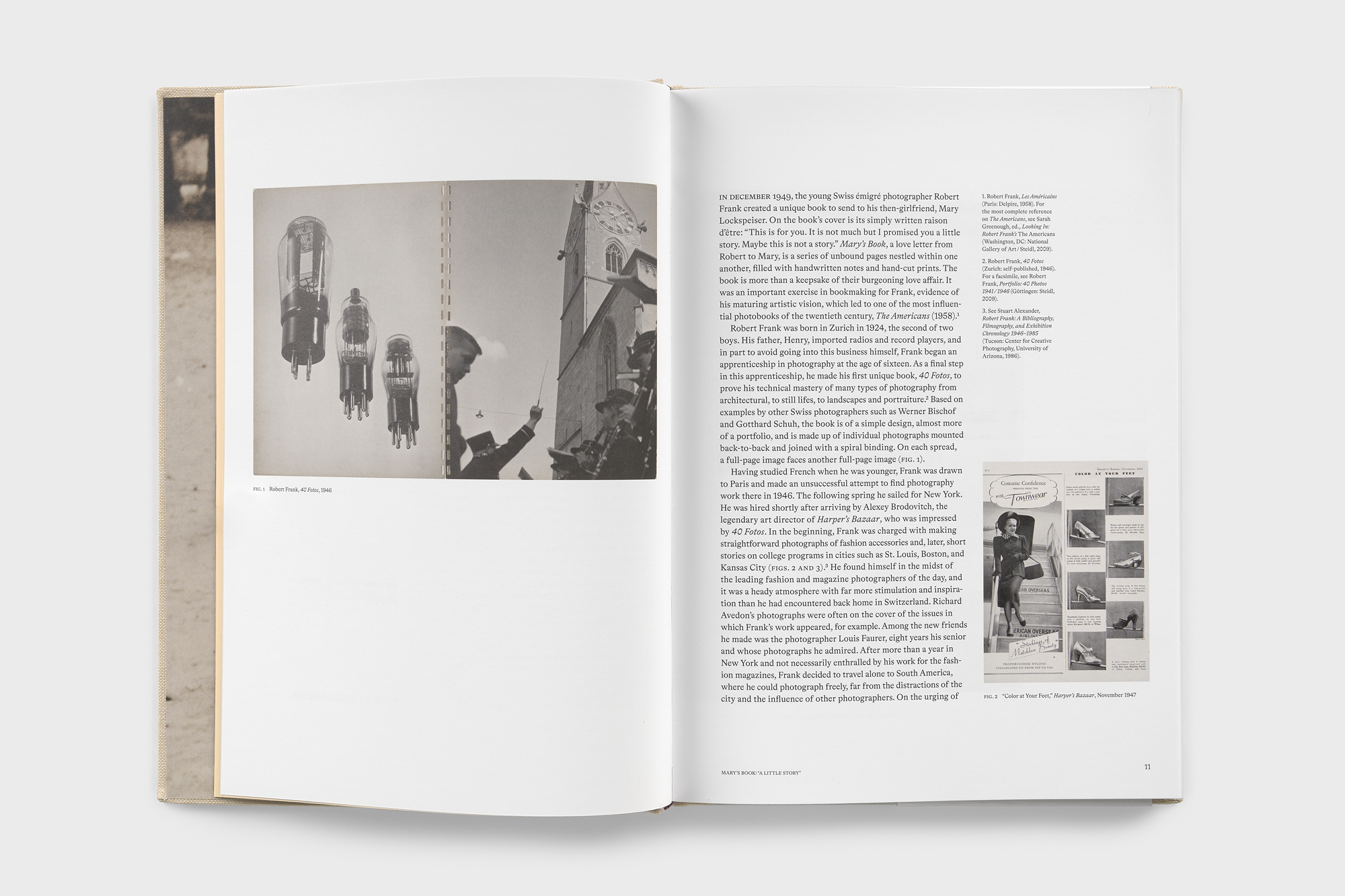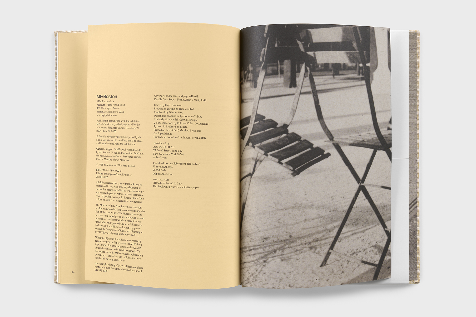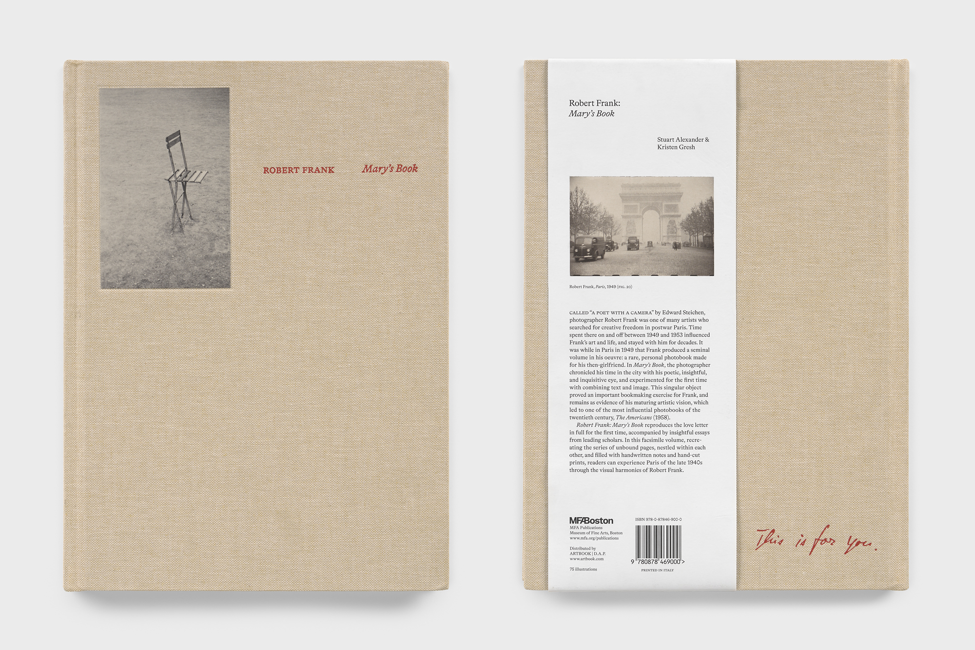 Robert Frank: Mary’s Book is a book about a book—and dons a meticulously crafted facsimile of Frank’s intimate 1949 photobook made for his then-girlfriend, artist Mary Frank. Classic and restrained, the design is built on deliberate choices: a red foil stamp on the cover, inspired by the wax pencil marks used on contact sheets; carefully considered finishes for every material—paper, cloth, and varnish—each contributing to the book’s tactile precision and quiet elegance.