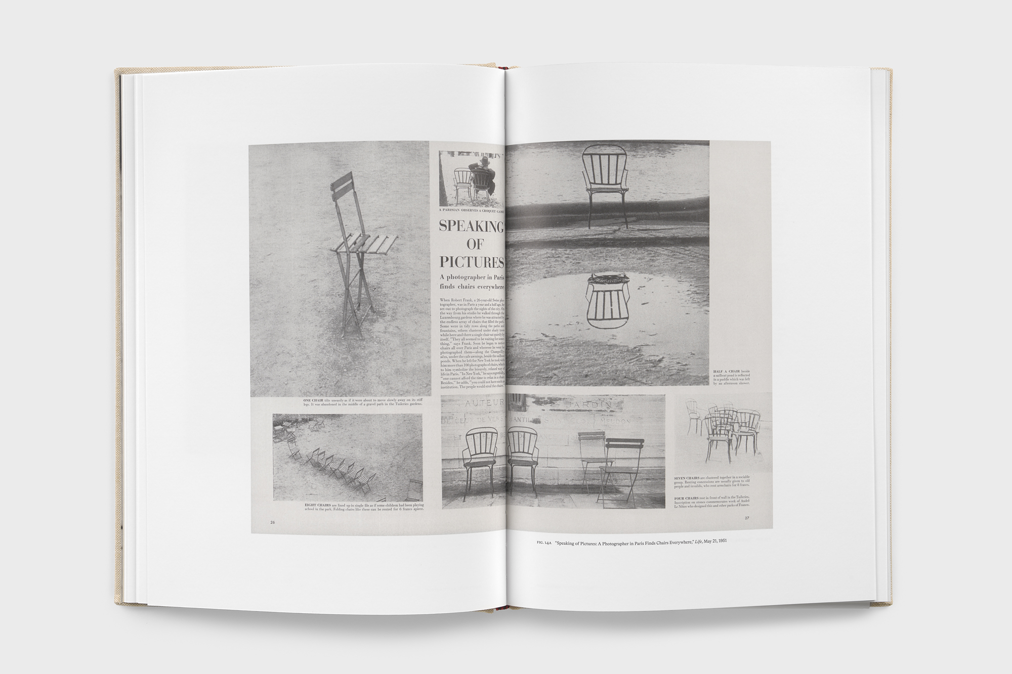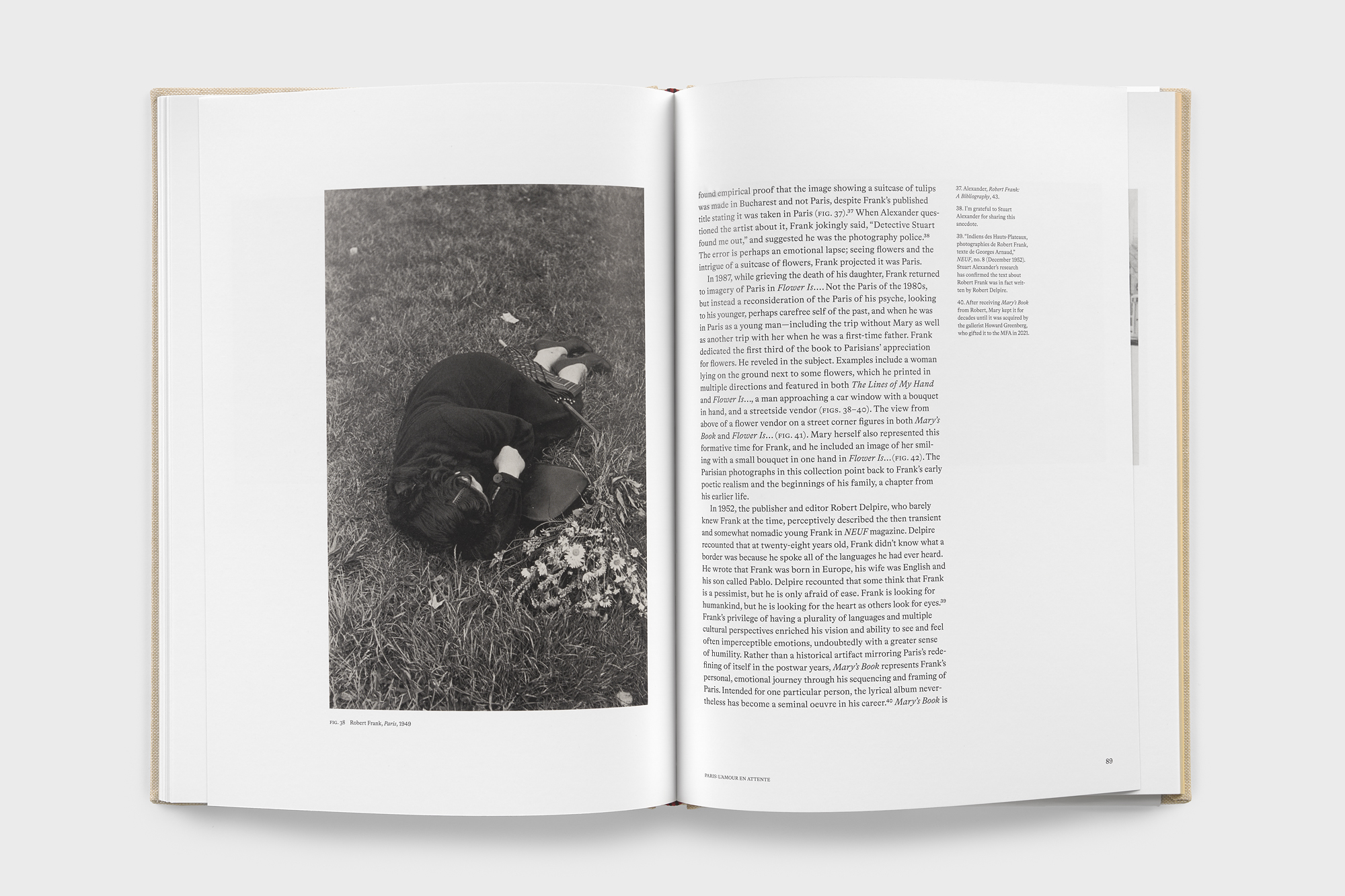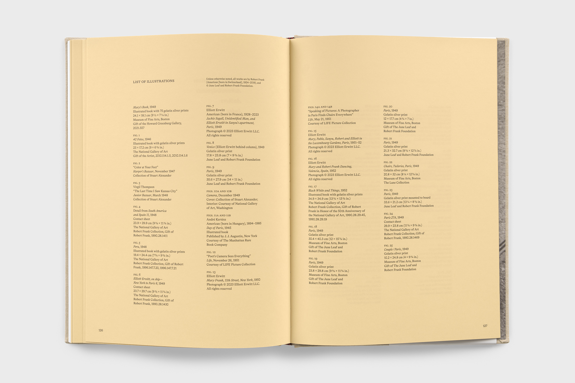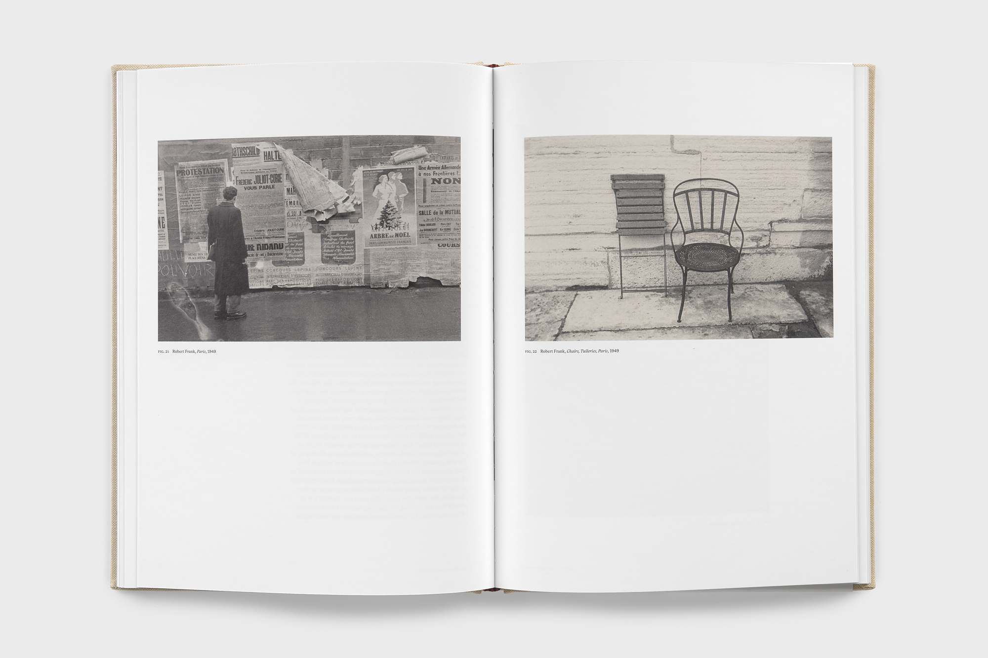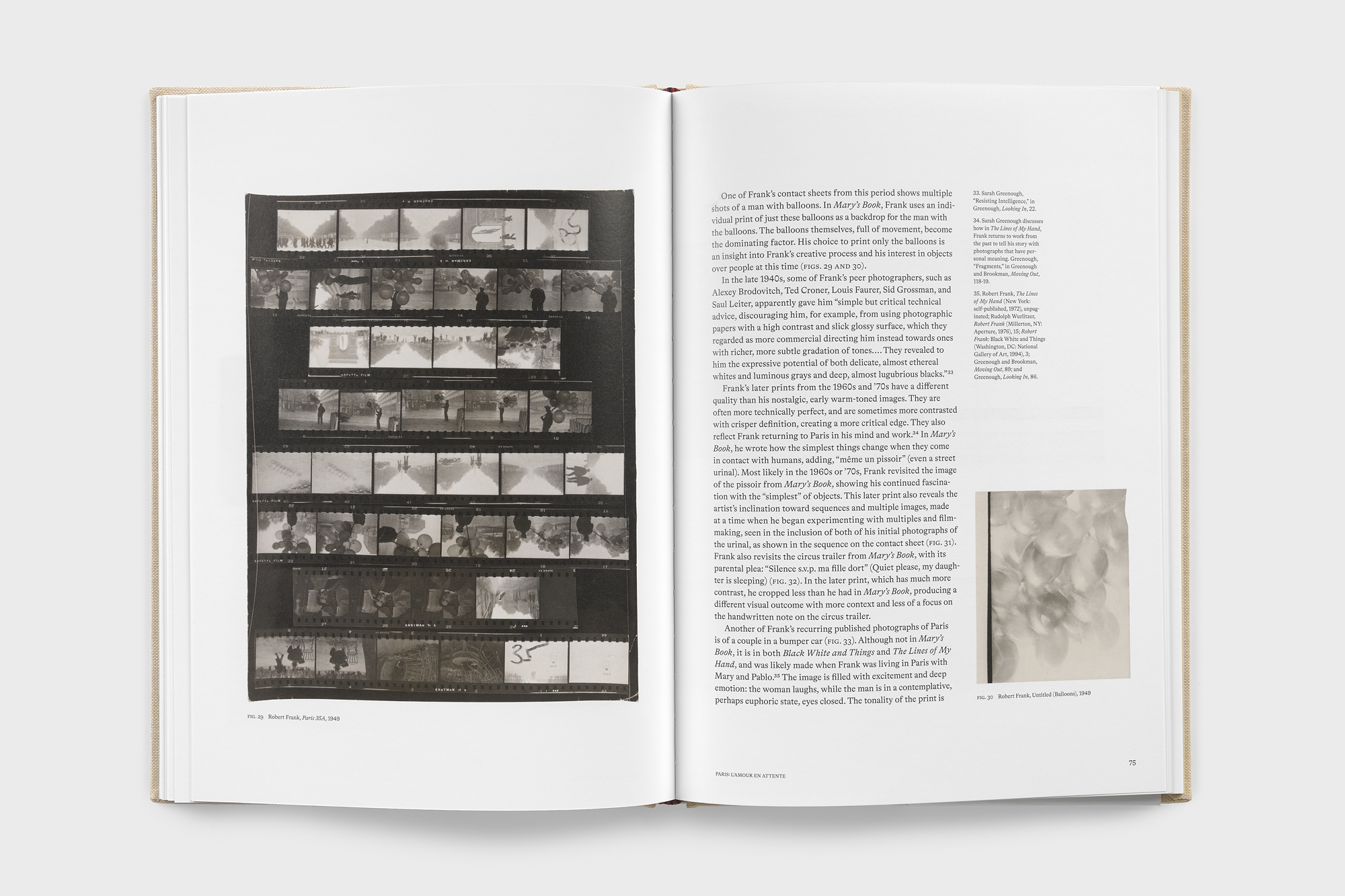 Using three distinct paper stocks, each section is given its own tactile and visual identity. The front and back matter—along with annotations for the facsimile—are printed on a warm buff stock, echoing the paper Frank used in his original. The essays and generously sized plates appear on a matte uncoated paper, yielding rich, velvety black reproductions. The facsimile itself is printed on uncoated stock, with each image finished by a spot-gloss coating that recalls the surface sheen of gelatin silver prints.